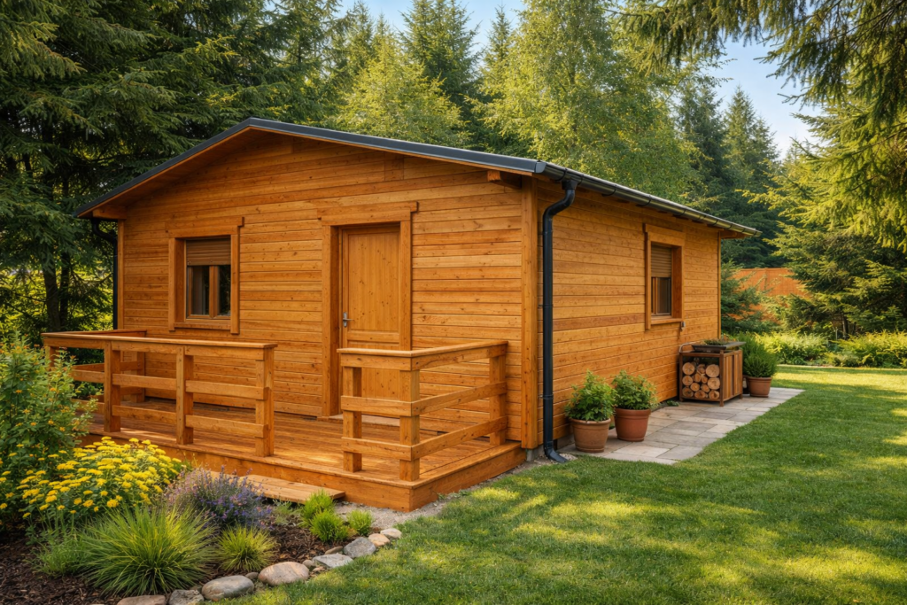 Sezonowy domek rekreacyjny idealny letni wypoczynek. Parterowy układ bez schodów oraz taras w standardzie tworzą wygodną przestrzeń wypoczynkową.